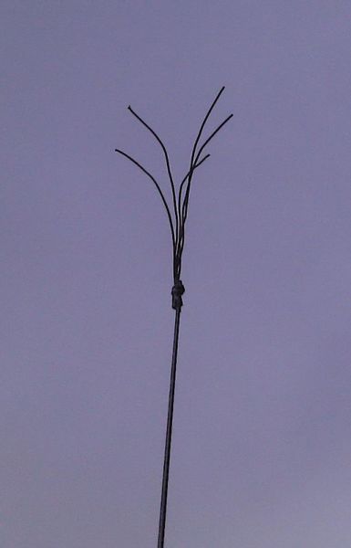 Так как основание от турбины 2001 стоит на авто было интересно поэкспериментировать с любыми автоантеннами сиби диапазона именно на этом турбиновском основании. Получился немного суррогат :) , но работоспособный. Думал втулить на прут емкостную нагрузку :) , мысли были разные, в итоге получилася метелка (веник) на кончике прутика :) 5 медных проволочек длиной 15 см концами были спаяны вместе и припаяны к верхнему концу антенного полотна. (фото в дальнейшем приложится)))) Добавочная катушка была закорочена и проверна антеннка на предмет настроки. Не получилось в 27 МГц попасть, уехала далековато вверх, даже на 29 не попала :). Пришлось таки чуток мотануть катушечки. Антенна стала на 24 МГц, видать переборщил с намоткой :) Укорачивая катушку приблизился к 26 МГц. Далее уже игрался с "емкостной нагрузкой" :) Немного укоротив все 5 усиков антенна уехала примерно на 27500 , причем усики как бы торчали вверх. По мере плавного отгиба их в стороны удалось настроить таким путем практически на расчетную частоту 27130. Причем настройка антенны очень чувствительна почему-то к варьированию этой самой метелкой :) Пока антеннко обкатывается на авто, разницы с полотном турбины особо не заметно, но таки надо просто выбрать время и сменой полотен посмотреть на разницу.