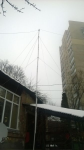 Мачта антенны составлена из метровых пластиковых канализационных труб. Внутри вставлена деревянная рейка (квадрат 15 мм). Рейка прикреплена к трубам с помощью саморезов. Мачта стоит на земле (живу в частном доме) Высота мачты - 9 метров. Мачта растянута двумя ярусами растяжек. Мачту, кстати, ставил сам. Намучился. Зато теперь знаю, что ее лучше делать металлической или стеклопластиковой. Простой пластик на больших длинах очень сильно гнется, даже несмотря на его усиление рейками.