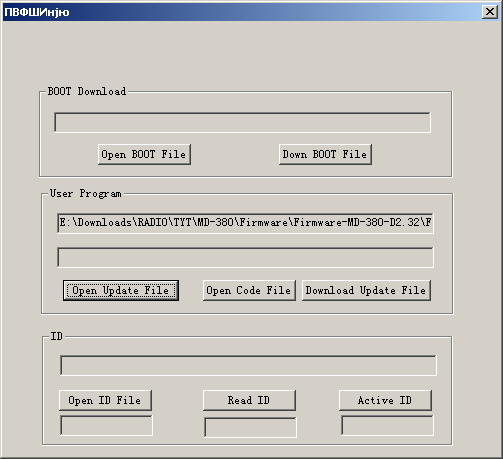 Для обновления прошивки необходимо отключенную станцию присоединить к компьютеру, затем удерживая нажатыми две верхних кнопки (программируемая и PTT) включить станцию. Станция начнет мигать светодиодом, сигнализируя о готовности к прошивке. На компьютере запустить прошивальщик, нажатием на Open Update File выбрать желаемую версию, а нажатием на Download Update File запустить процесс.