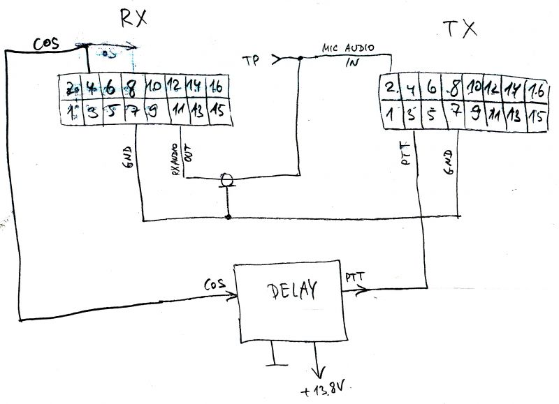 5) Соединительный кабель между радиостанциями. Очень желательно использовать экранированный провод для соединения звукового выхода приемника со входом передатчика. Этот же сигнал нужно вывести на тестовый контакт, куда будет удобно в процессе настройки подключать измерительные приборы. Фирменные мотороловские разъемы и контакты к ним продаются на Диджикее, номера 104422-1-ND и A3007-ND. Вместо них с успехом можно использовать обычные 16-контактные колодки (2 ряда по 8 контактов) с шагом 2.5 мм. У некоторых радиостанций стоит 16-контактный разъем, а у других - 20 контактный, из которых используются внутренние 16 выводов (при этом первый вывод расположен не с краю).