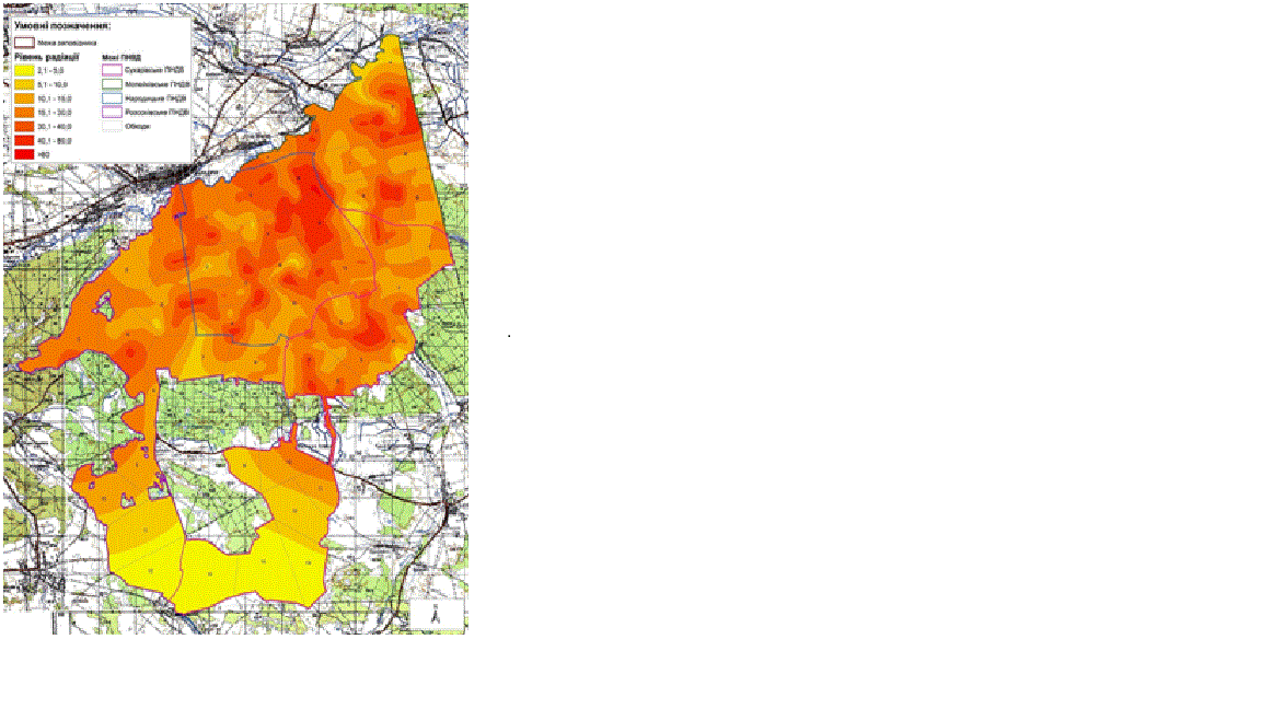 Карта забруднення території Древлянського заповідника Цезієм-137.