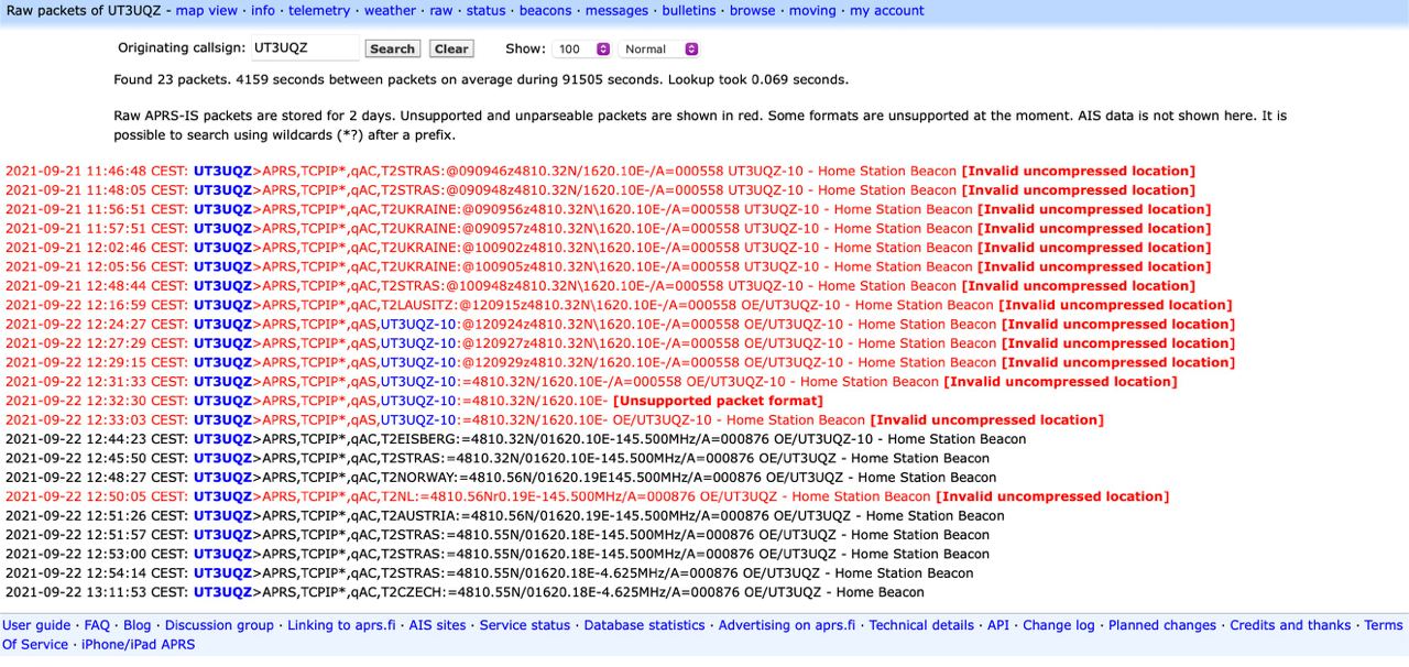 • Методом проб и ошибок начал реплицировать эти данные и отправлять их на сервер, попутно наблюдая свои "сырые пакеты" на сайте aprs.fi в разделе "raw packets"